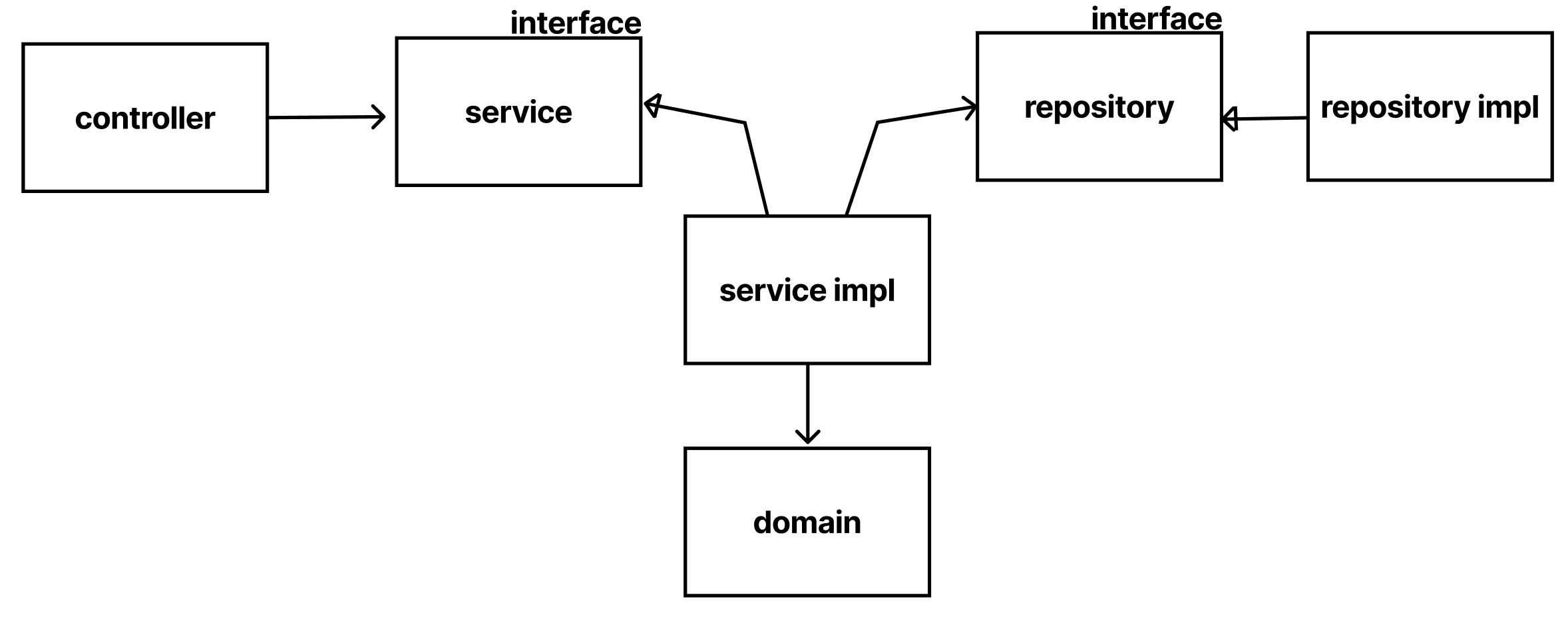 Controller는 추상화된 Service에 의존하고, 그걸 구현하는 impl이 있고, ServiceImpl은 추상화된 Repository를 의존하고, 그걸 구현한 Repository Impl이 있게 됩니다.